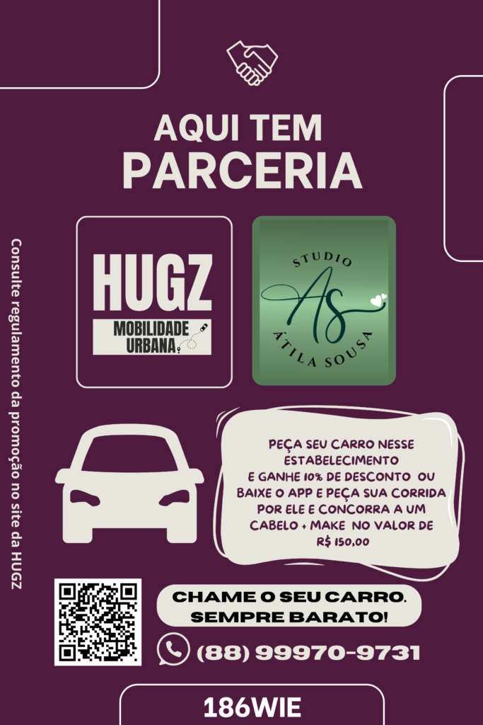 A cada chamada de carro advinda do estabelecimento STUDIO ÁTILA SOUSA via telefone, WhatsApp ou app, R$0,50 da corrida serão creditados na conta cadastrada na HUGZ da pessoa responsável pelo estabelecimento STUDIO ÁTILA SOUZA.